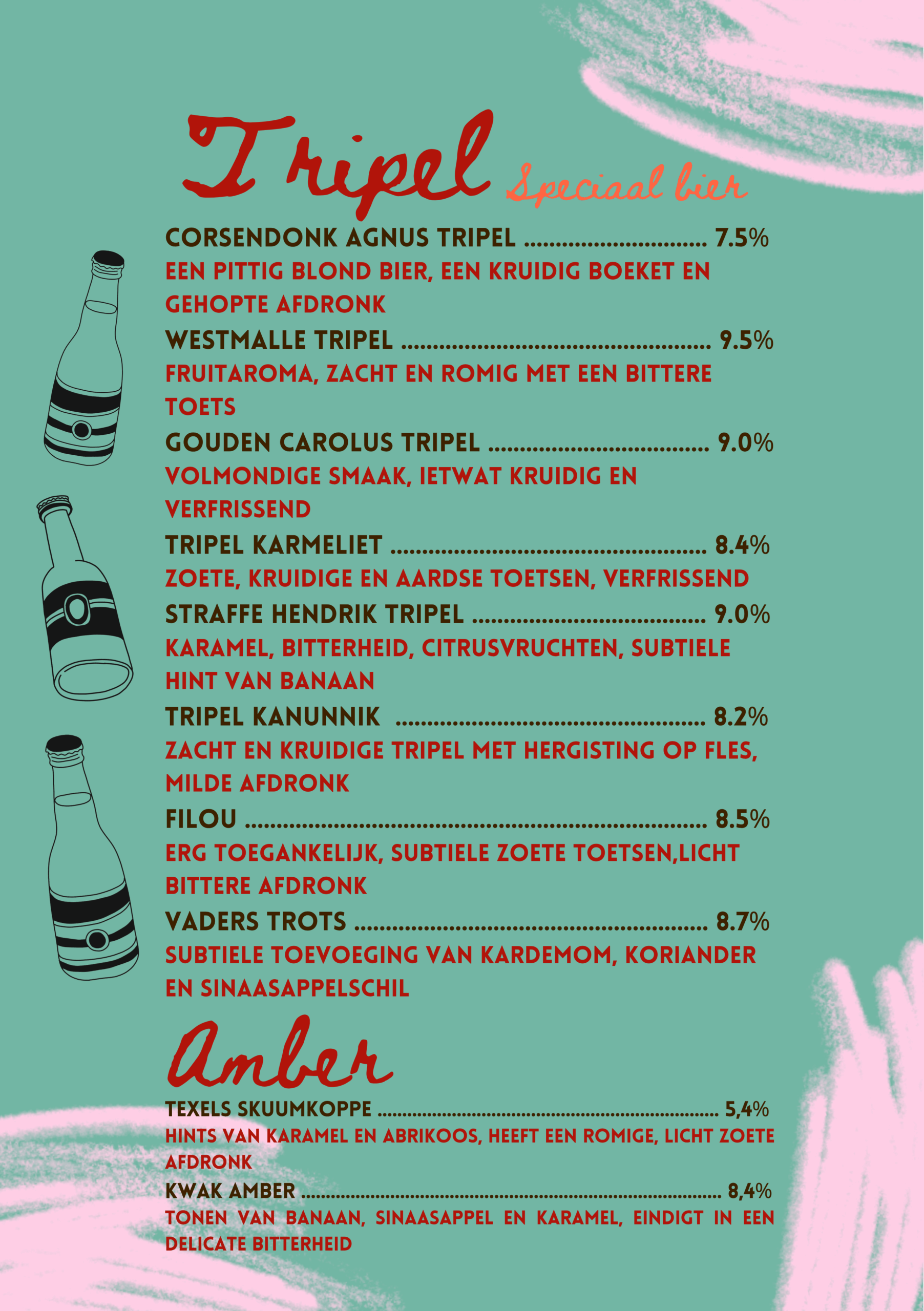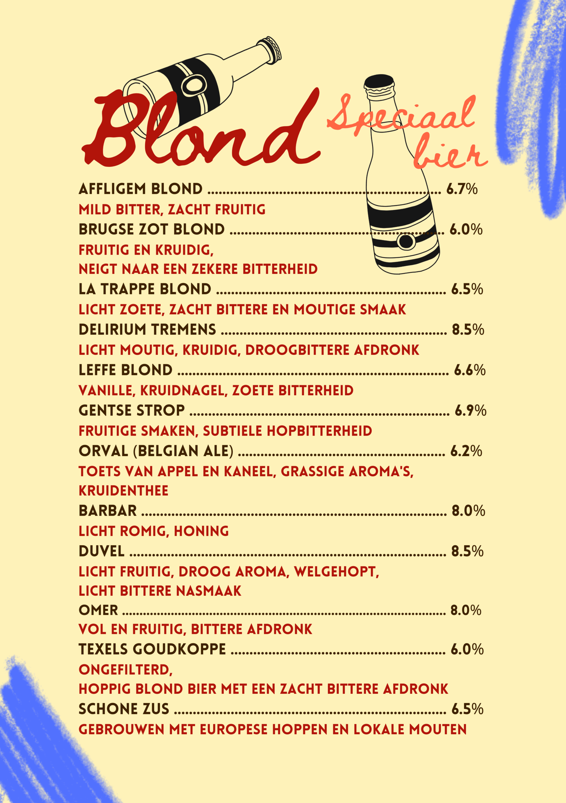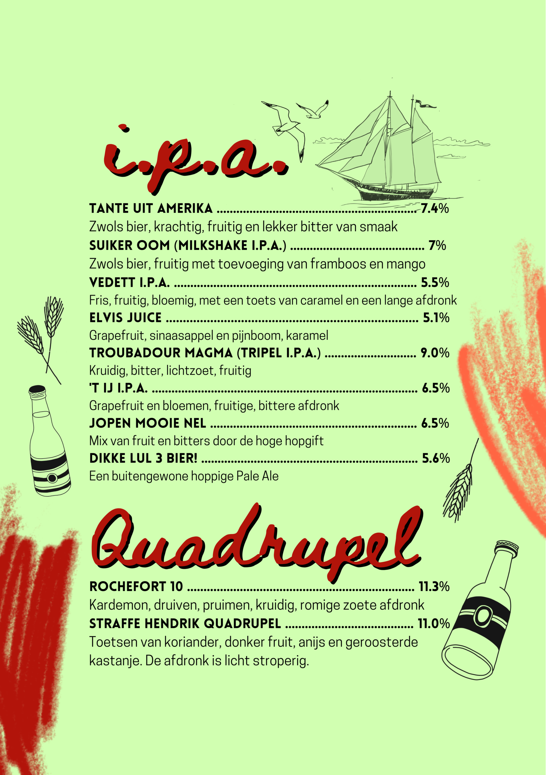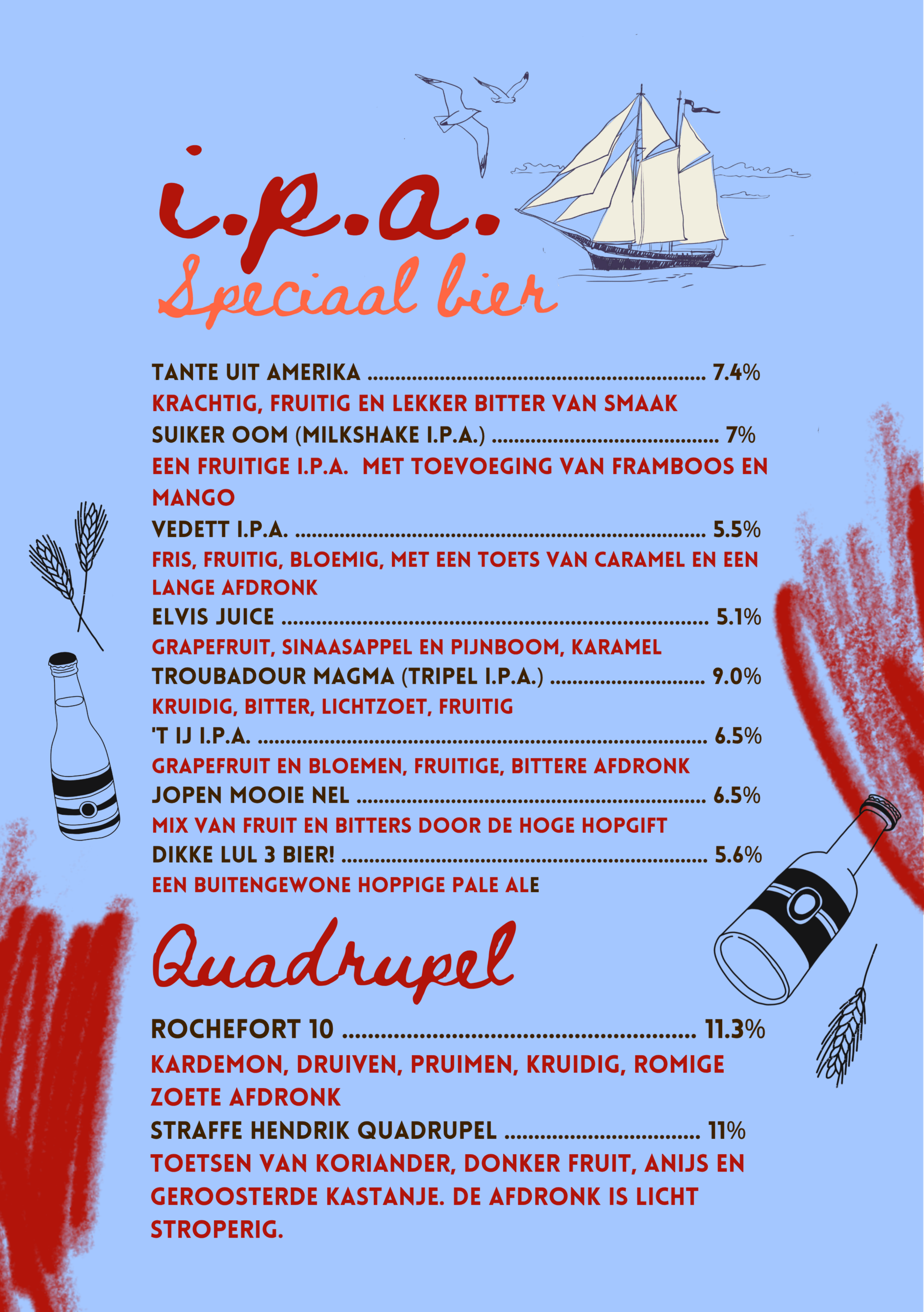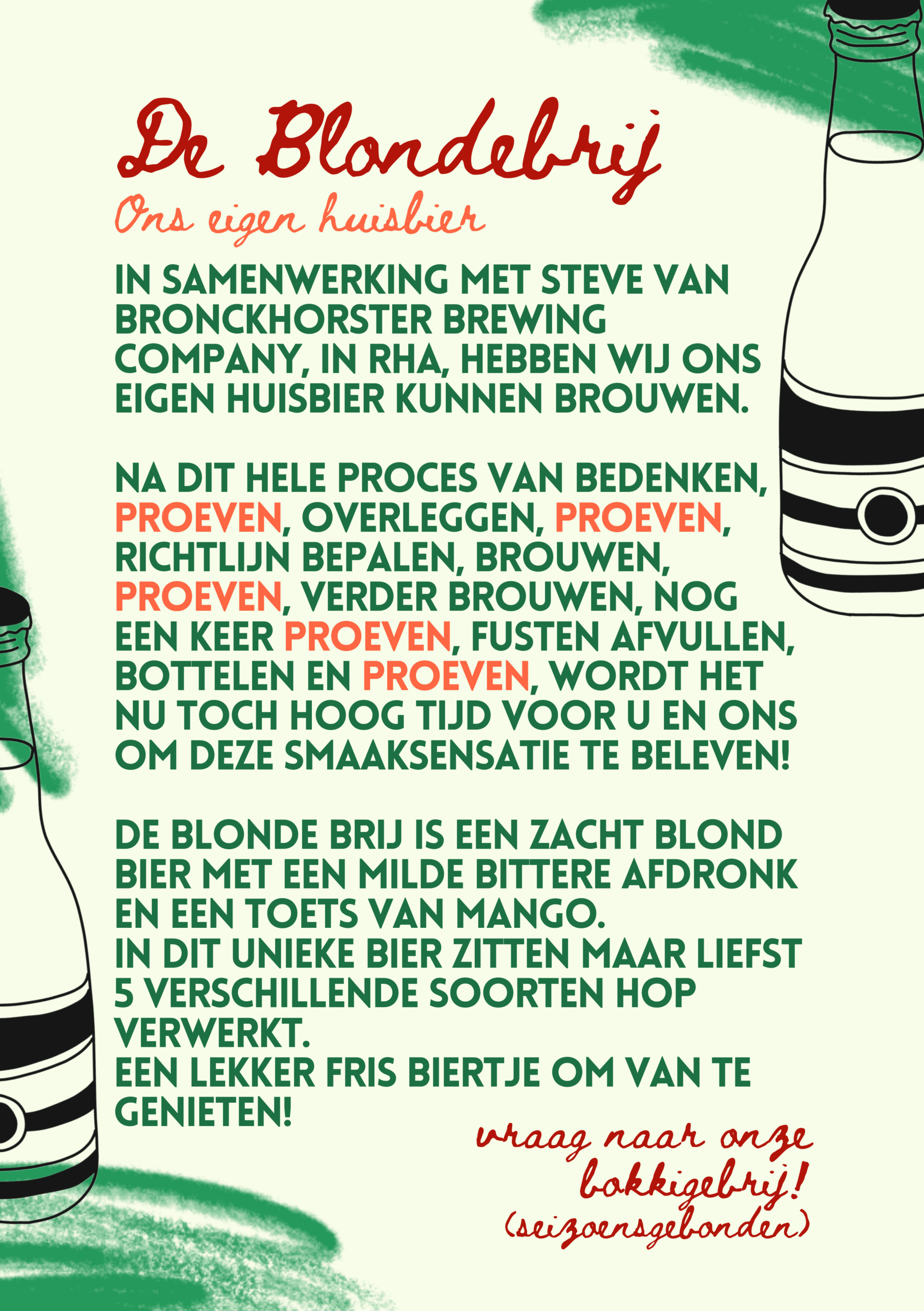Na een lang proces van bedenken, proeven, overleggen, proeven, richtlijn bepalen, brouwen, proeven, verder brouwen, nog een keer proeven, fusten afvullen, bottelen en proeven, hebben wij onze eigen bieren gebrouwen. Kom langs om deze smaaksensaties te beleven!