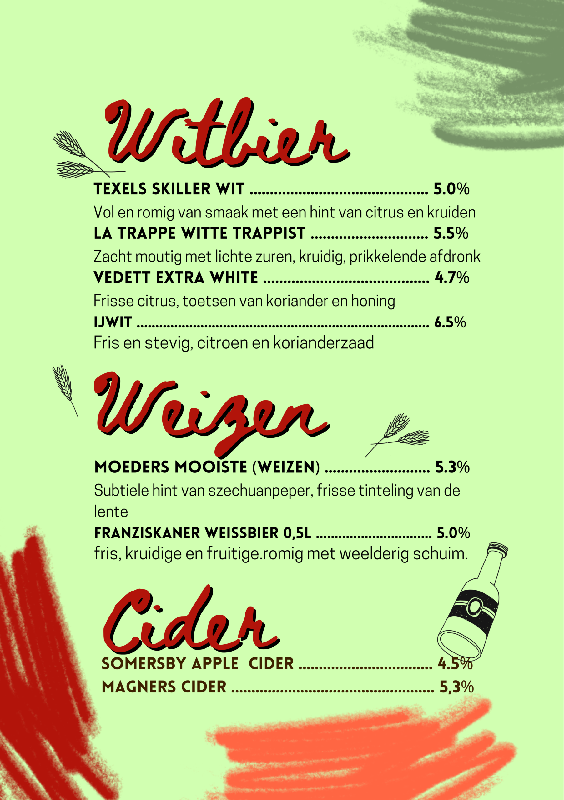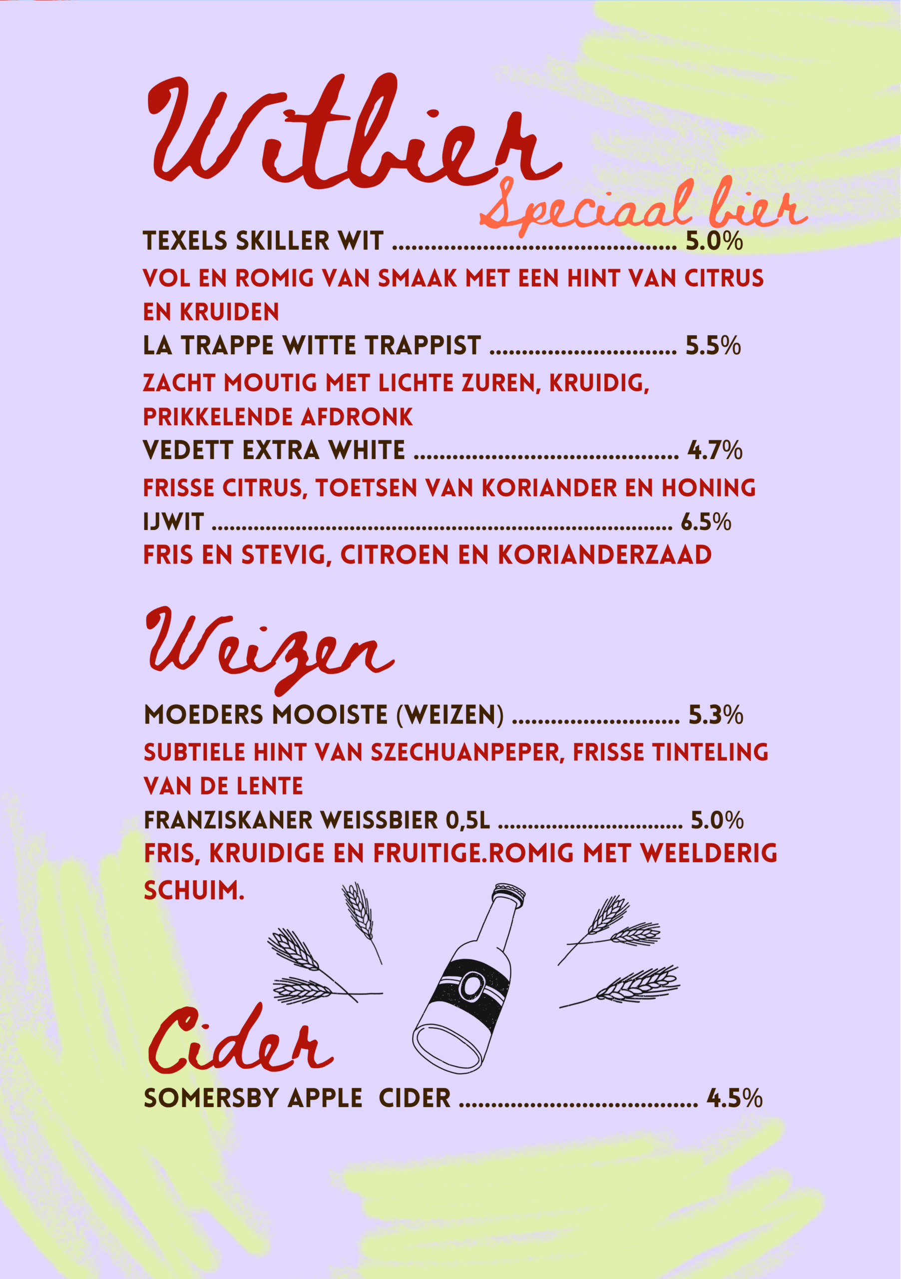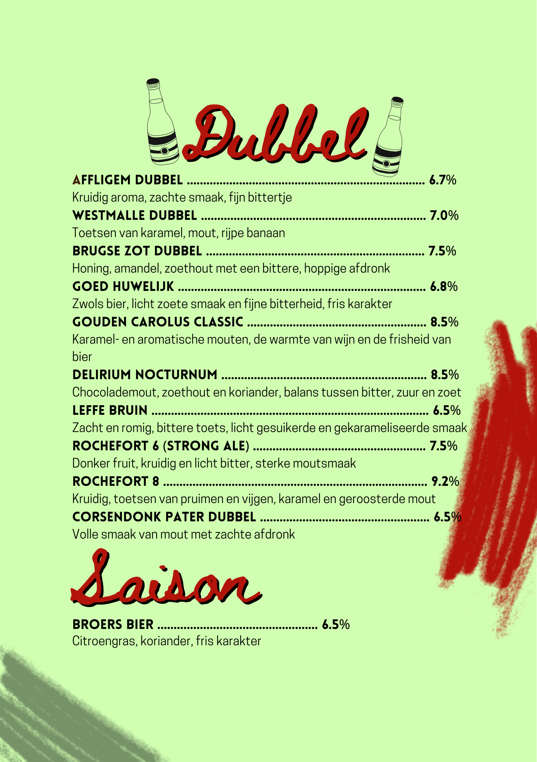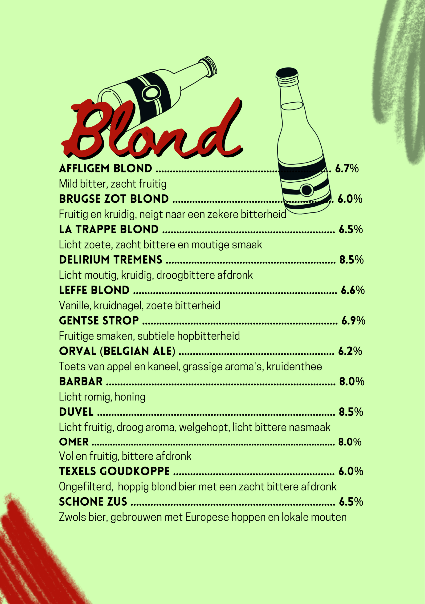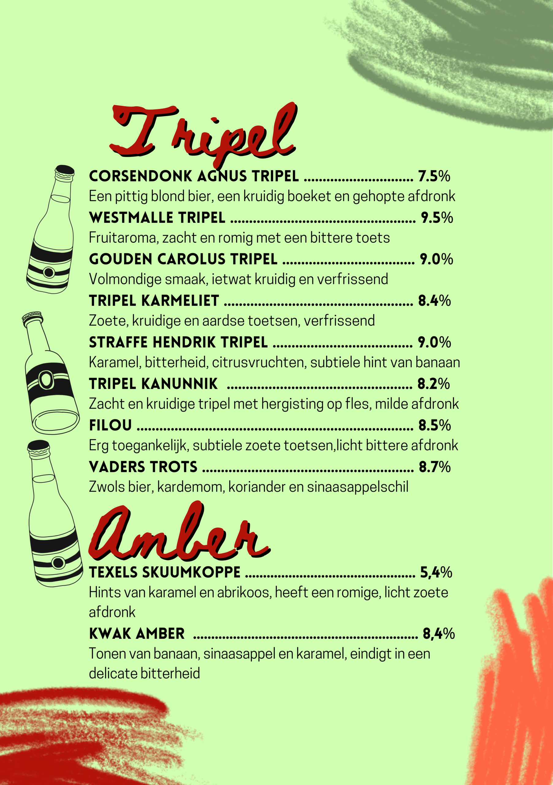 Na een lang proces van bedenken, proeven, overleggen, proeven, richtlijn bepalen, brouwen, proeven, verder brouwen, nog een keer proeven, fusten afvullen, bottelen en proeven, hebben wij onze eigen bieren gebrouwen. Kom langs om deze smaaksensaties te beleven!